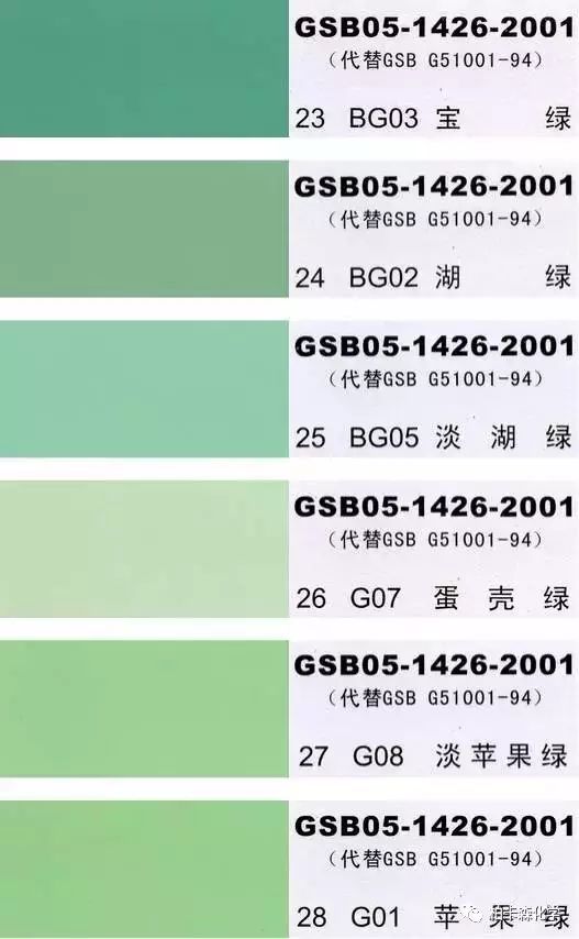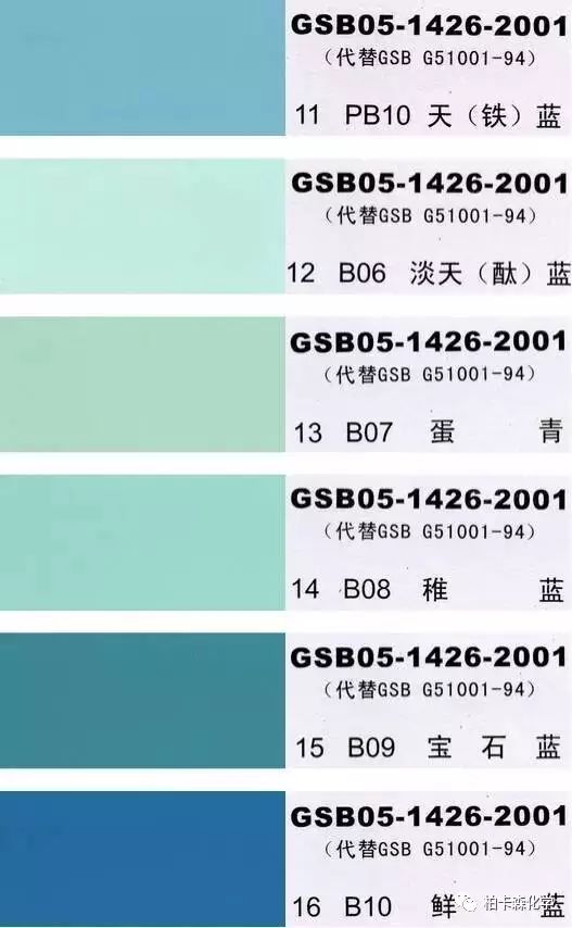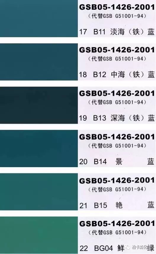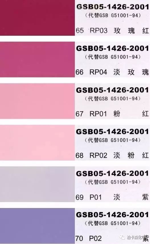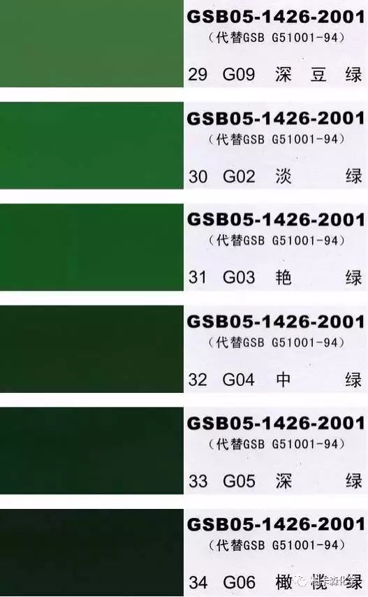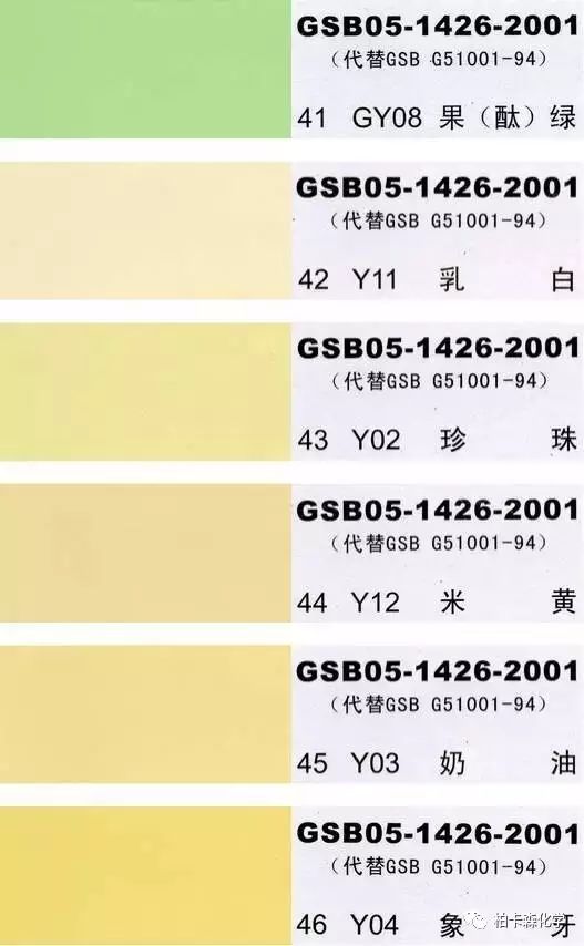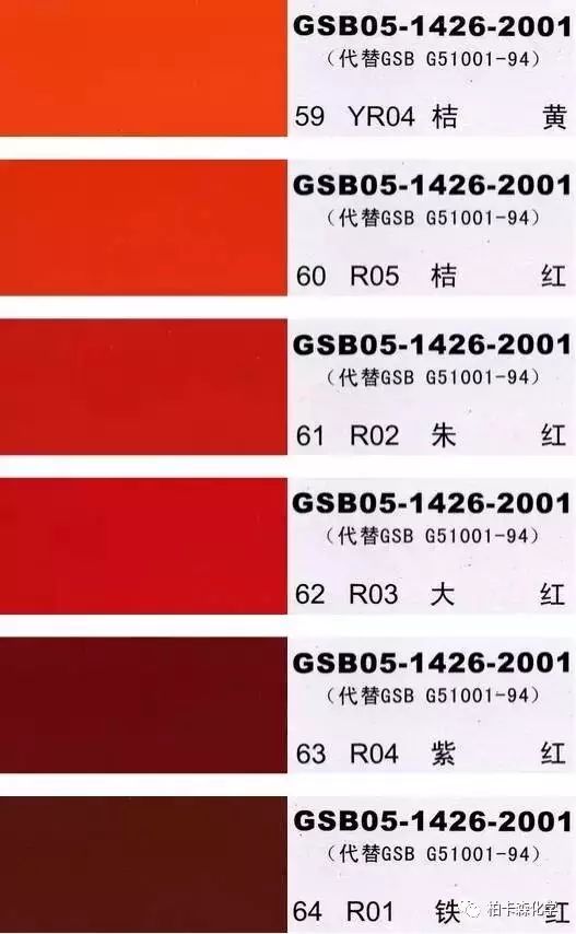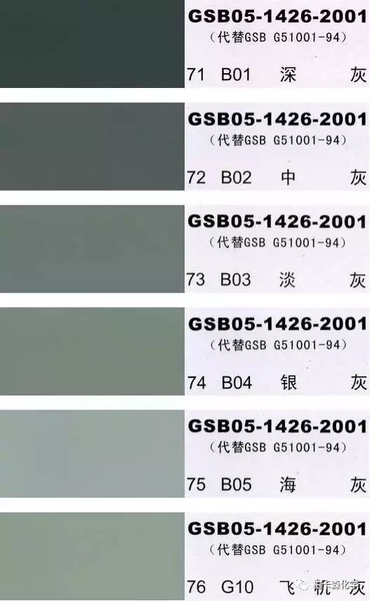 GSB05-1426-2001;全國涂料和顏料標(biāo)準(zhǔn)化技術(shù)委員會(huì)修訂,含83種顏色,光面效果。每個(gè)顏色都有國家統(tǒng)一標(biāo)準(zhǔn)的編號(hào),適用于油性涂料方面使用。