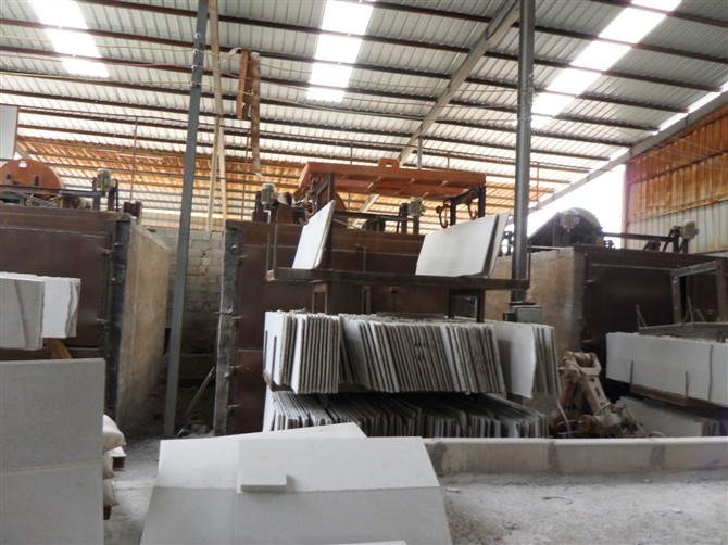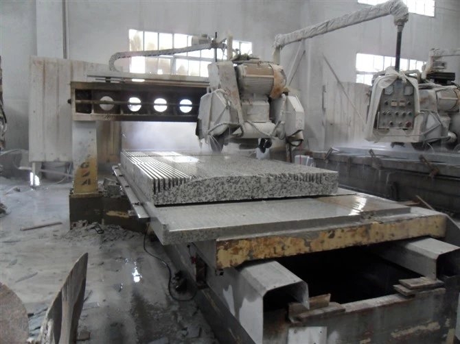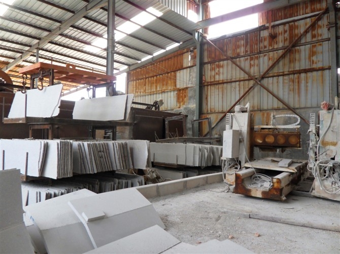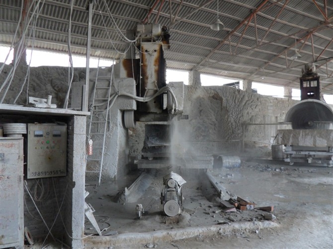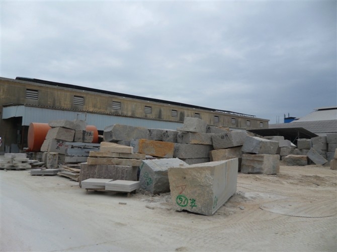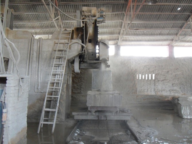 2、鋸割加工(荒料加工)。開采出來的大石塊叫做荒料,一般是用金剛石圓盤鋸進行鋸解加工成石板,對于大理石,則還可以用金剛砂鋸進行加工。金剛石圓盤鋸使用一個大的圓盤形鋸片,鋸片上鑲嵌有粉末冶金粘接的金剛石顆粒。這種設(shè)備可以加工硬質(zhì)石材,使用也比較靈活,缺點是圓盤的直徑需要二倍的石材高度加上法蘭盤直徑,而太大的鋸片直徑制造不易,因此不利于加工較大規(guī)格板材。金剛砂鋸是使用一排(多條)條狀鋸片,每條鋸片類似于木匠使用的手工鋸鋸條,但金剛砂鋸是多條平行排列,每條之間間隔與板材厚度相等,這樣砂鋸可以將整塊荒料一次性鋸解成很多片板材。但是金剛砂鋸由于使用金剛砂作磨料,不太適合加工硬質(zhì)的花崗巖,一般只用于加工大理石。另外,如果荒料中有缺陷,在加工前沒有被發(fā)現(xiàn)的話,由于金剛砂鋸加工是一次性完成,等到加工完發(fā)現(xiàn)缺陷就來不及了,將導(dǎo)致整塊荒料報廢,所花的加工費也浪費了,因此不適合缺陷較多的石材品種。鋸割加工中主要的加工設(shè)備是花崗石專用的框架式大型自動加砂鋸、多刀片雙向切機、多刀片電腦控制花崗石切機和花崗石圓盤鋸石機等。經(jīng)過鋸割的板材稱為毛板。