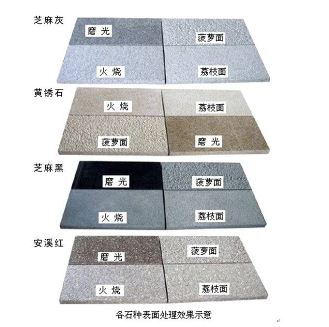 (1)拋光(Polished):表面非常的平滑,高度磨光,有鏡面效果,有高光澤?;◢弾r、大理和石灰石通常是拋光處理,并且需要不同的維護以保持其光澤。
