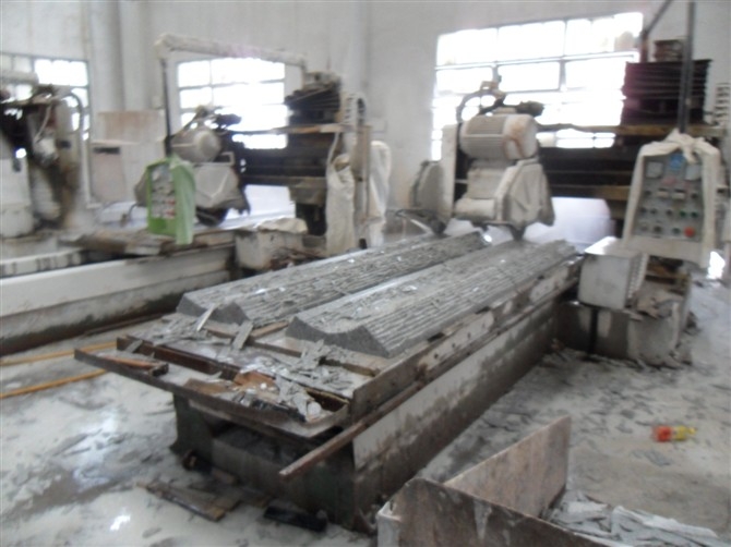 3、研磨拋光。研磨拋光的目的是將鋸好的毛板進一步加工,使其厚度、平整度、光澤度達到要求。該工序首先需要要粗磨校平,然后逐步經(jīng)過半細(xì)磨、細(xì)磨、精磨及拋光,把花崗巖的顏色紋理完全展示出來。主要的加工設(shè)備是:自動多頭連續(xù)研磨機、金剛石校平機、橋式磨機、圓盤磨機、逆轉(zhuǎn)式粗磨機、手扶磨機。一般使用金剛砂作磨料?;◢弾r拋光,一般使用復(fù)合材料膠結(jié)的金剛砂磨塊(也叫磨頭)進行拋光,一般有1#、2#、3#、4#、5#和0#,共6種磨塊,1#較粗,5#很細(xì),0#則是不含金剛砂的拋光膏。加工時一般從1#到5#順序進行,然后使用0#拋光。大理石拋光,一般使用毛氈加蠟再加各種不同顆粒粗細(xì)的金剛砂細(xì)粉進行拋光。經(jīng)過拋光的板材稱為光板。