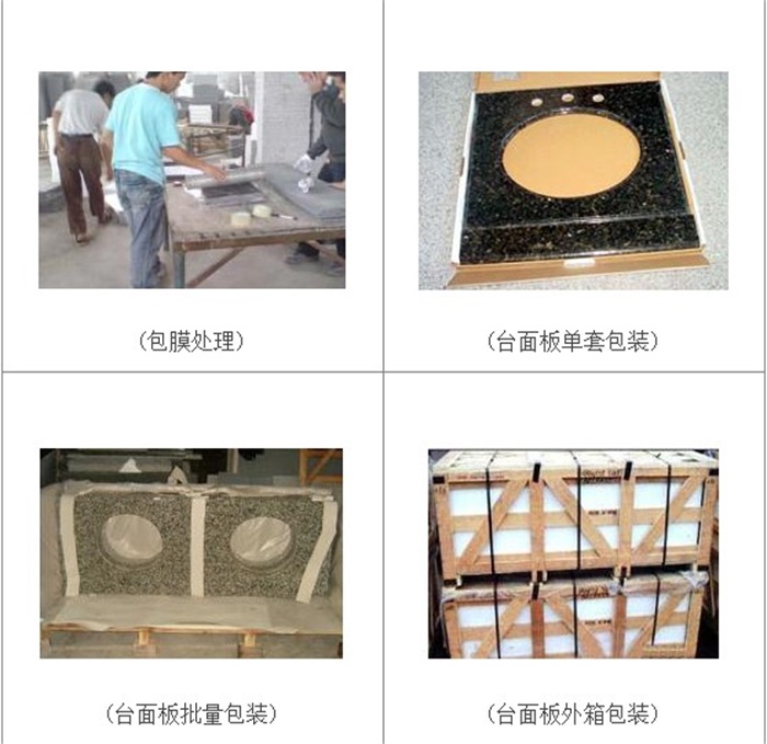 包裝時根據(jù)客戶要求或石質(zhì)對產(chǎn)品進行包裝,鈍面與鈍面相對,在光面之間夾防劃傷的軟膜片。至于一些怕劃傷的石材,像一般顏色較深石材(如山西黑),為防止刮傷影響視觀會進行包膜處理。臺面板要垂直擺放,使石材縱像受力,千萬不要橫放。要好打包帶包所有的臺面捆成一個整體,不要松動。最后,大功告成,臺面板就這樣制作包裝完畢了,可以發(fā)貨了。