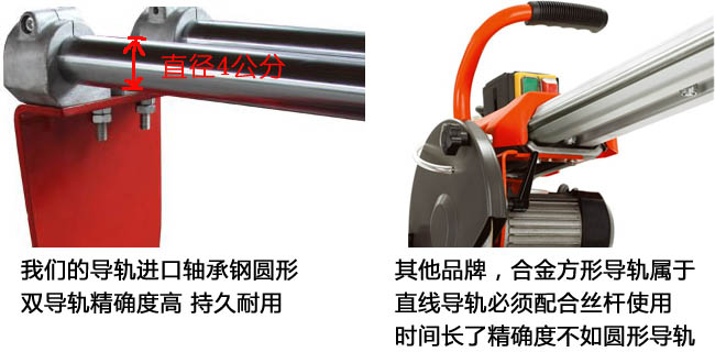 1.我們的瓷磚切割機導軌都是用進口的軸承鋼圓形雙導軌。表面鍍硬鉻,硬度達到60度。精度誤差僅0.2毫米。且雙圓形導軌比起方形導軌來說精準度可以一直保持下去。而方形導軌屬于直線導軌必須配合絲桿使用,時間一長精準度就會不如剛使用的時候,誤差就變大。