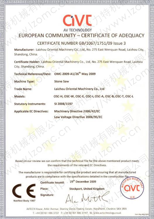 另:萊州歐力特機械是一家成立于1996年的老牌外資企業(yè)。公司生產(chǎn)的石材切割機全都符合歐盟ce認證標準,產(chǎn)品銷往國外40多個國家和地區(qū)。選擇歐力機械的瓷磚切割機選擇的是放心的質(zhì)量和完善貼心的售后服務(wù)
